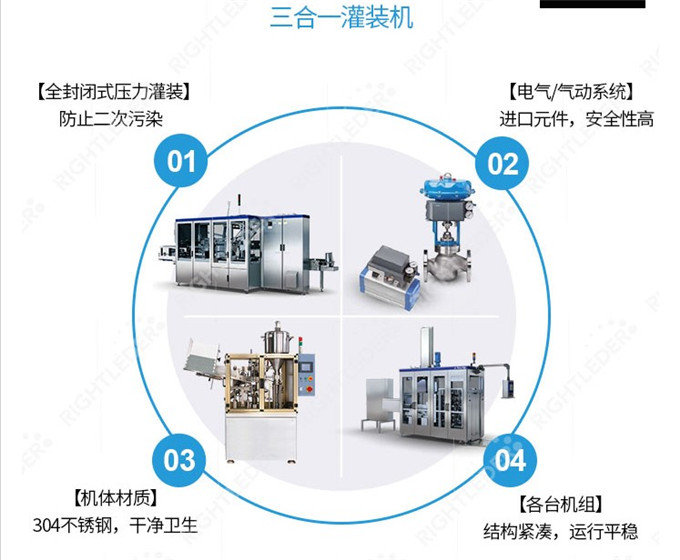 14.小瓶三合一灌裝機:三合一灌裝機將沖洗、灌裝、封蓋三功能組合在一個機體上,全過程實現自動化,適用于聚脂瓶灌裝礦泉水、純凈水等不含氣飲料,本機選用優質的SUS304材料制作,主關件部件采用數控機床精密加工,整機采用先進光電檢測各部件的運行狀況,具有無瓶不灌裝,無瓶不送蓋,自動化程度高,簡易的人機界面的操作顯示屏。